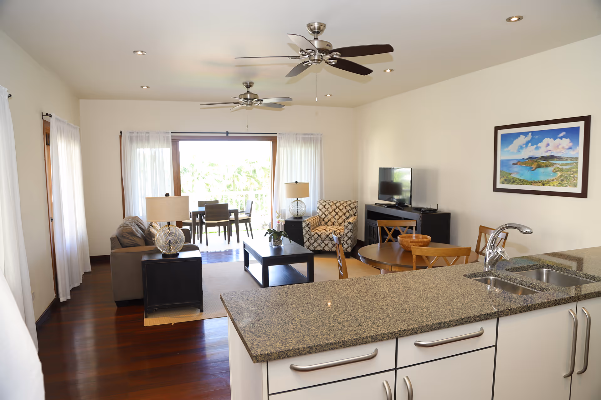 تتمتع هذه الشقة المؤثثة بالكامل بغرفة نوم واحدة بإطلالات مرتفعة على المحيط وبيئة جزيرة هادئة. تم تصميم السكن على الطراز الاستعماري الجورجي الهندي الغربي الكلاسيكي، ويقع على مسافة قصيرة من الشاطئ الرملي المحاط بأشجار النخيل ويستفيد من موقع بجانب التل بعيدًا قليلاً عن الشاطئ، مما يوفر الخصوصية والإطلالات المفتوحة عبر الخليج.