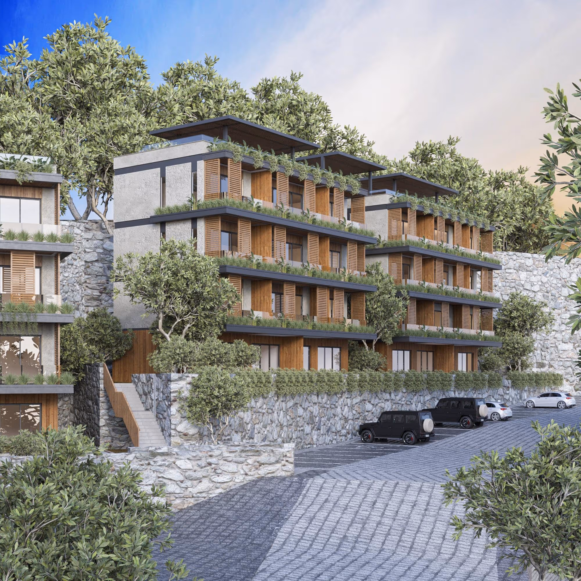 Hillside Haven Saint Lucia is an exclusive residential development featuring luxury 1 and 2-bedroom apartments (53.1-122.7 sqm) that blend seamlessly with the island's natural hillside terrain. The project showcases sustainable architecture using natural wood and stone, cascading terraced gardens, and expansive outdoor spaces that maximize breathtaking Caribbean Sea views.